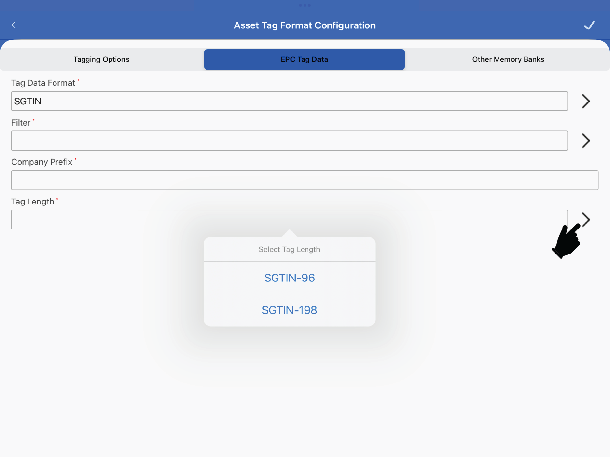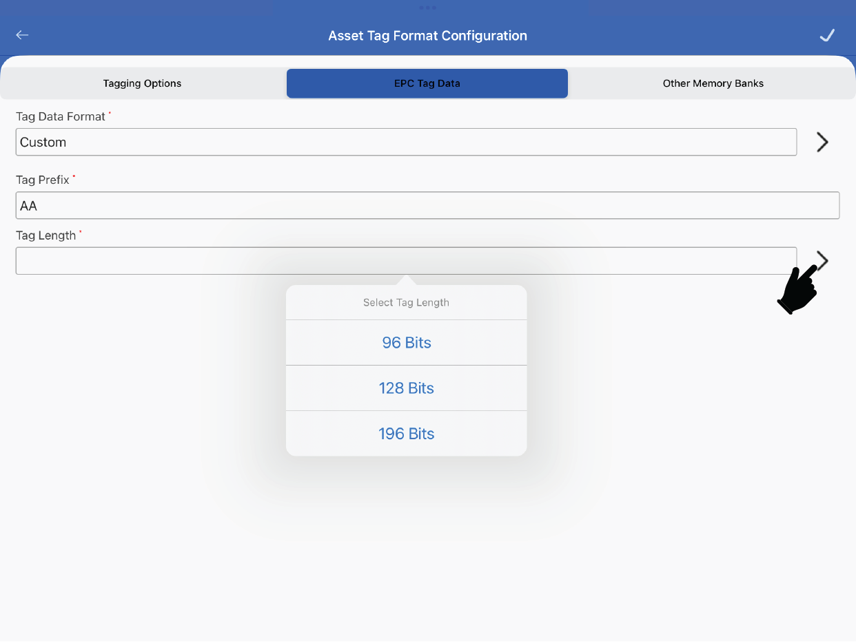 a. If “Custom” is selected, then please also enter “Tag Prefix” for maintaining prefix in the Tag ID. Also select the “Tag Length” from 96 Bits / 128 Bits / 196 Bits. This is the size length, which can be encoded in the tag memory.