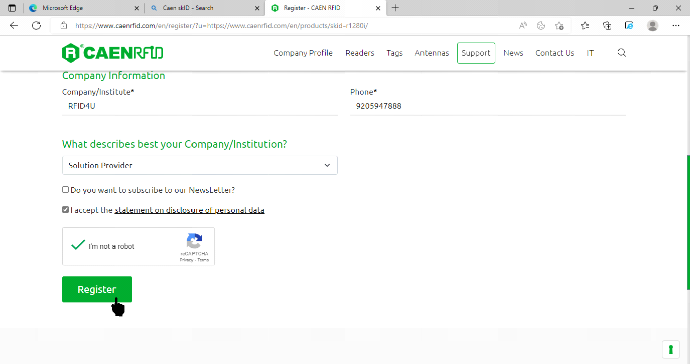 5. If you are new on CAEN website fill the registration form and click on the "Register" button.