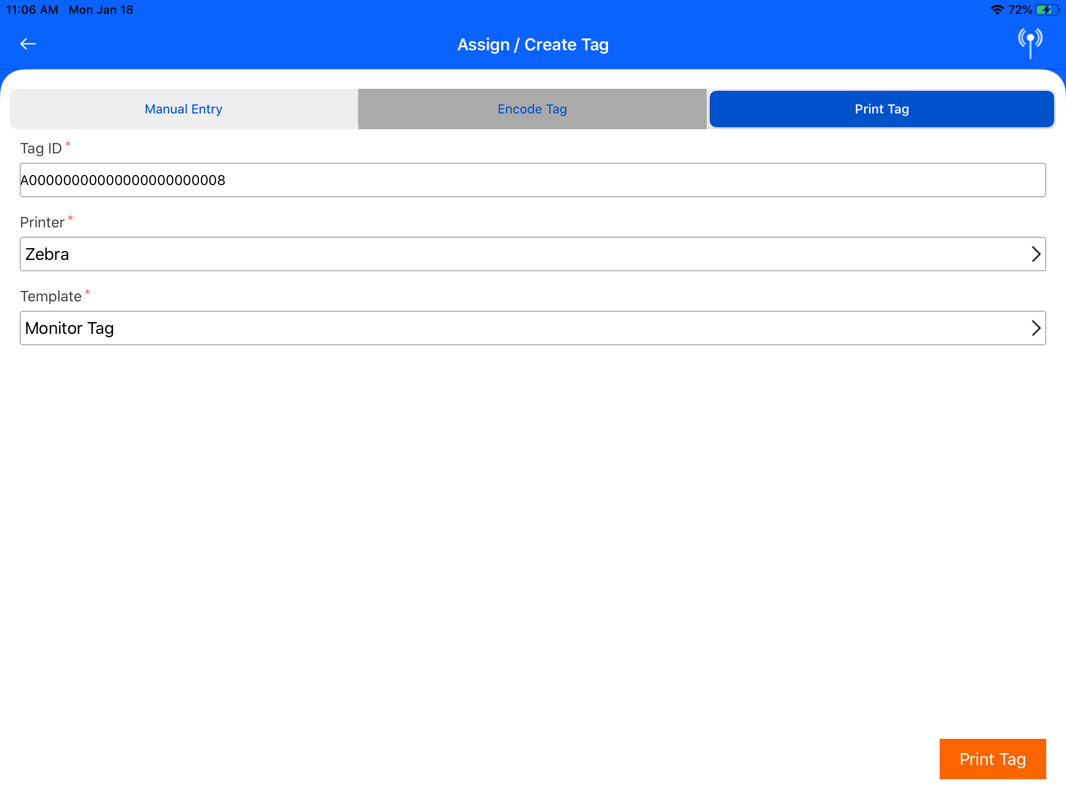 Before printing an asset tag, enable print tag and set the EPC tag data value in the asset tag format configuration. While printing an asset tag, select tag id in creating asset it navigates to the assign tag id page.