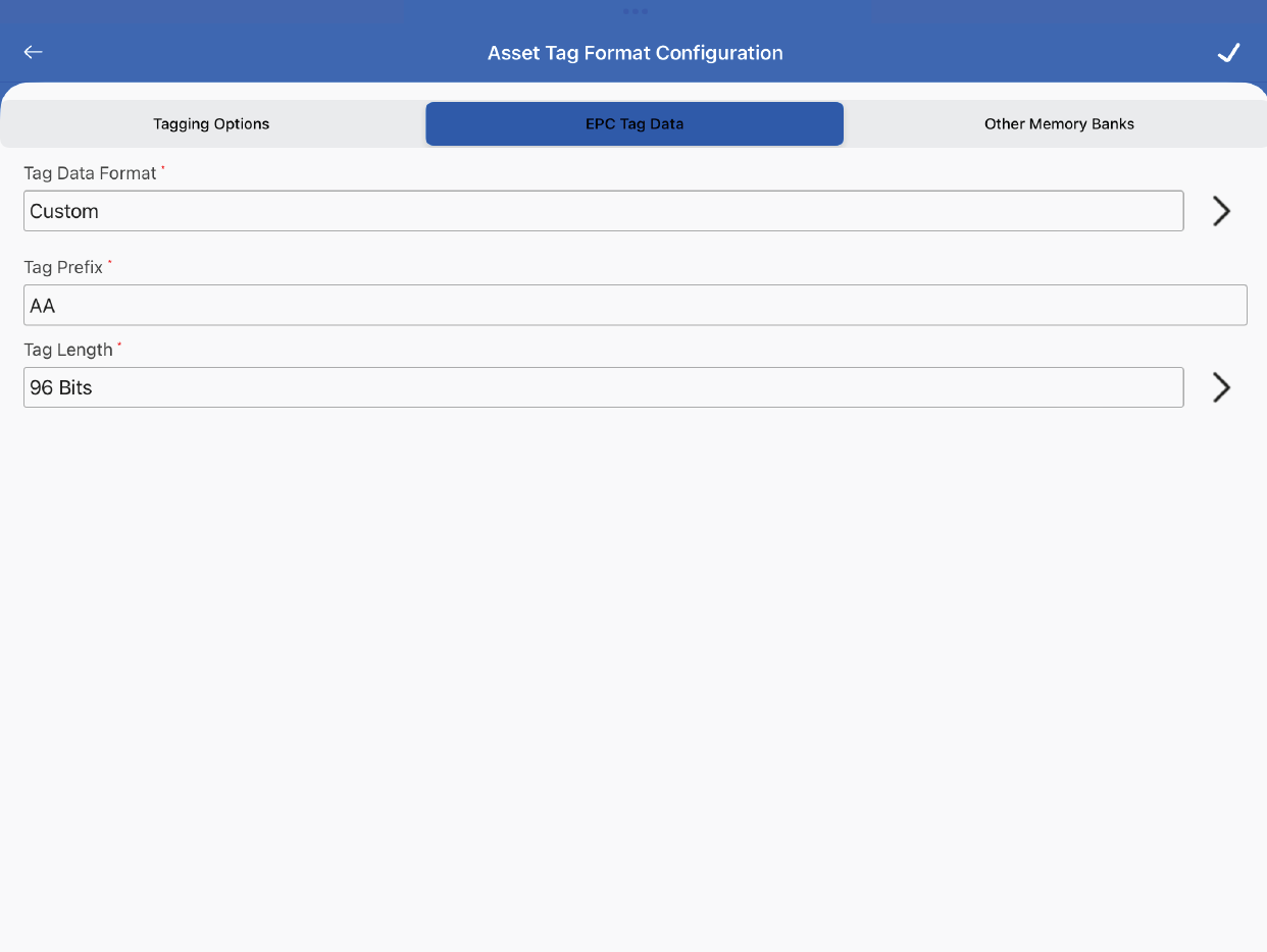 You can choose the following options - Tag Data Format: Either choose a custom schema where you can define your own encoding rules or use the SGTIN format.