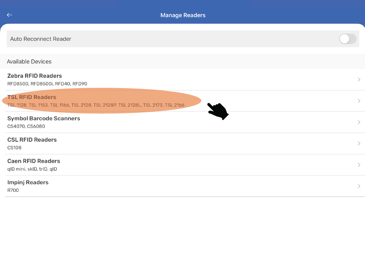 Open TagMatiks AT Lite and go to the Manage Reader Page. The Manage Reader page is located under the Settings tab. In the Reader Model dropdown menu, select TSL Readers