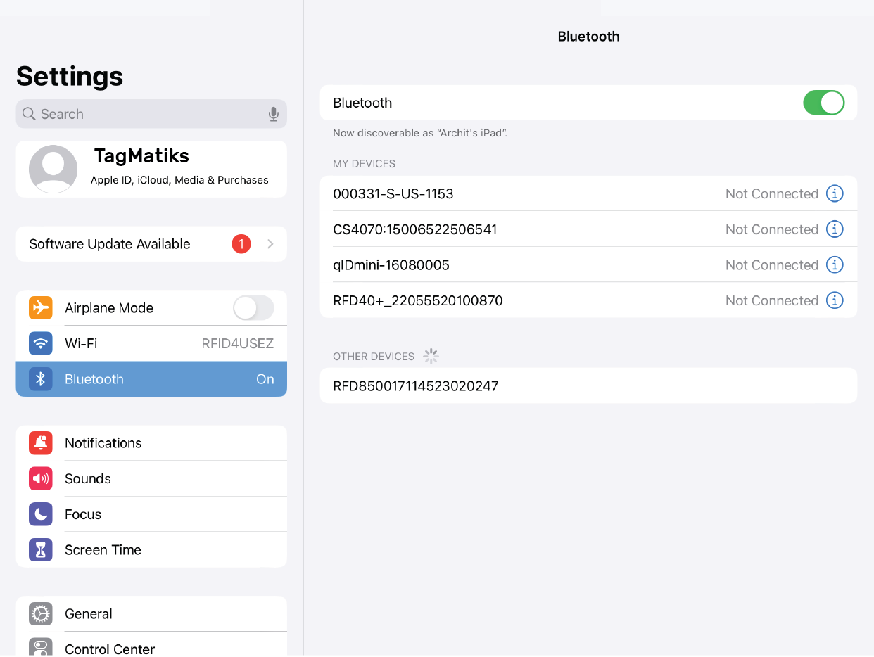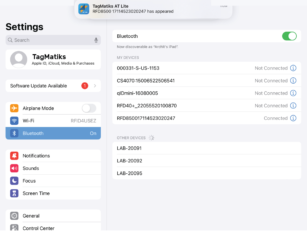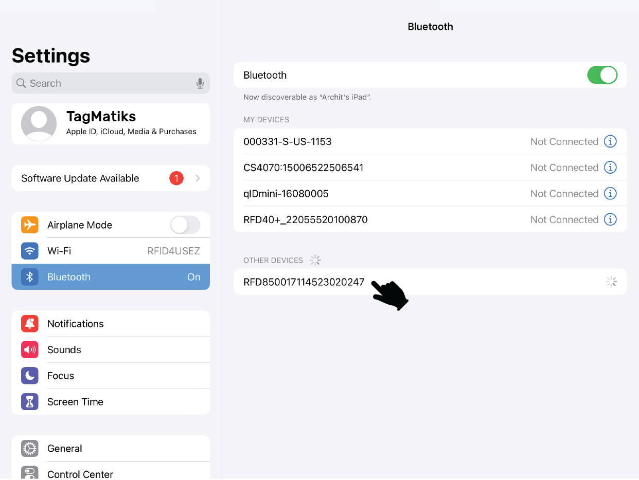 You’ll need to pair the reader to your iPhone or iPad device using the iOS Bluetooth pairing process before using it with TagMatiks AT Lite.