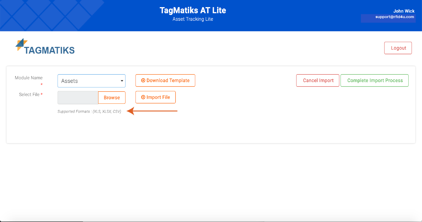 It should be noted that TagMatiks AT Lite supports .XLS, .XLSX & .CSV formats for uploading the Asset details and only files in these formats will be imported without error.
