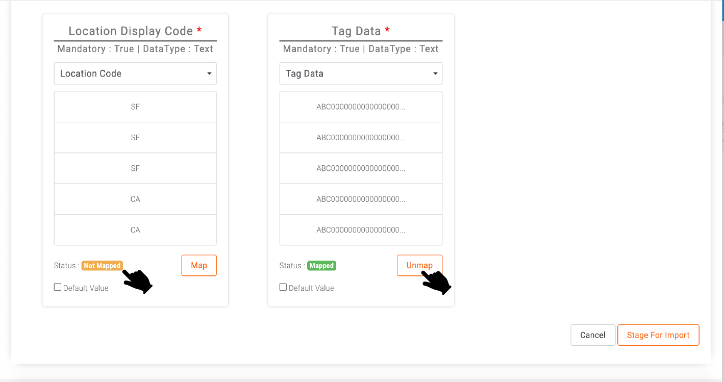 All the header fields should be mapped with their respective fields before clicking “Stage for Import”.
