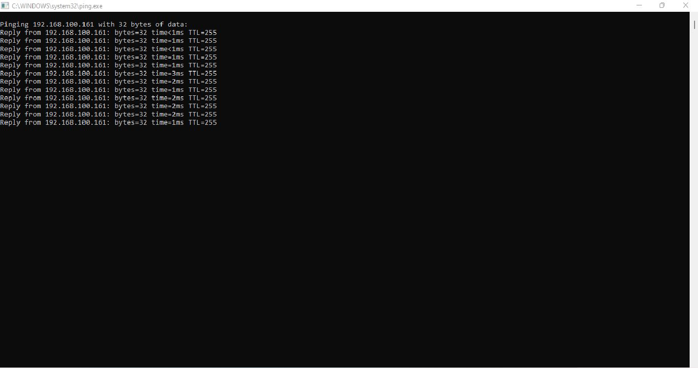 IX. you will probably see the reply as “Reply from 192.168.100.161: bytes=32 time=2ms TTL=64”, as shown below: