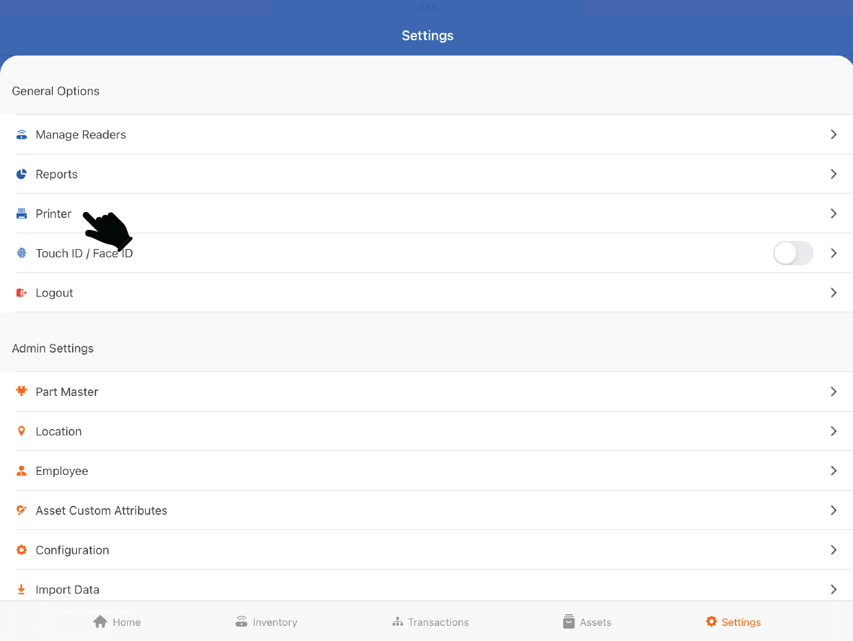 1. To connect the printer with the IOS device, Open TagMatiks AT Lite and log into it. Tap on Settings.